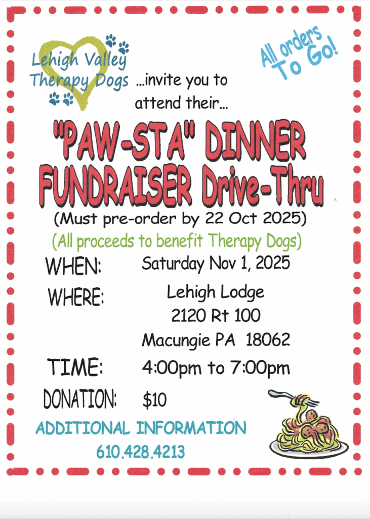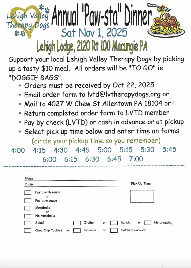 November 2025 “PAW-STA” FundraiserBy Amanda Greene / September 11, 2025 September 11, 2025 Lehigh Valley Therapy Dogs “PAW-STA” Dinner Fundraiser Drive Thru Pre-orders must be received by October 22,2025.